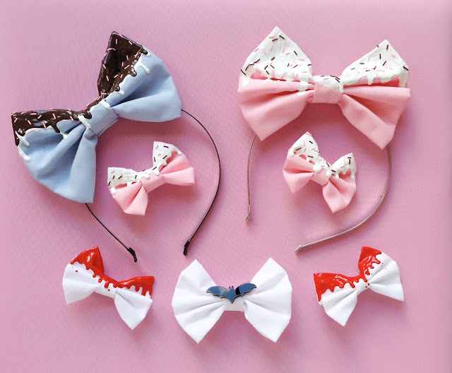 These are the bows I am going to be reviewing. This is an older collection by Bow Kuma, and they have since expanded their "drip" collection into all kinds of great colors, glow in the dark, and even a cookie bow! You can see in the photo the size differences of their large (two headbows), medium (bat bow), and small (pink cake and blood) size bows.