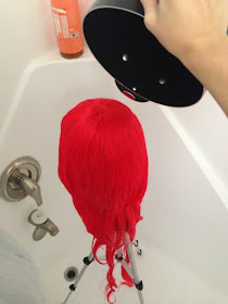 You want to make sure the wig is completely soaked. It would be fine to just start with pouring the water over the top of the wig, but I quickly dipped the ends in the water and swished it around really fast to make sure they got wet. This particular wig style has two long pieces that are much longer than the rest of the wig, so that was a precaution I took to ensure the pieces got wet.