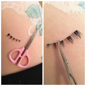 *NOTE: Before you apply glue, you should hold the lashes up to your eye first to measure them. Then you should trim the lash strip to fit the length of your eye. Since I have giant peepers, I forgot to photograph this step as I don't normally need to trim mine.