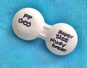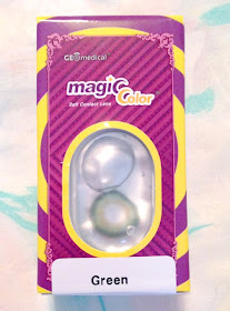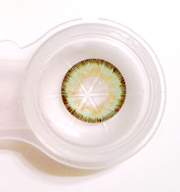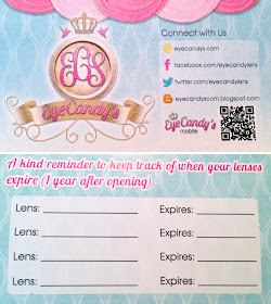 On the left side, I have the sponsor (so I can always remember who to credit in photos!) (PP = Pinky Paradise) and brand of lenses (Geo). To the left, I have the style (Super Size Nudy) and color (Green). Easy! :)
