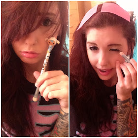 Awww, sad puppy can't put her makeup on because her hair is wild. Ah! But look! Now she has some pink velcro pads for her hair and she can put on her makeup with ease!