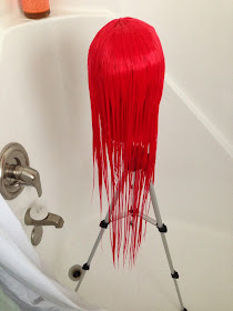 Then you just pour the water over the top of the wig and watch the magic happen. The heat allows the fibers to be reshaped right before your eyes. Remember, the wig must hang completely straight for the wig to dry straight. It may take a few pots to get the wig completely soaked. I think I heated and poured three pots for this wig.